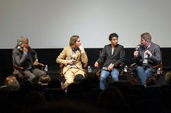 Elvis Mitchell interviewt Adam Stockhausen, Wes Anderson (2.v.l.) und Tony Revolori (3.v.l.), 2014